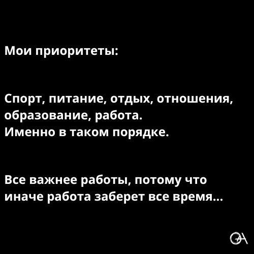 - Отдых: Я убежден, что качественный отдых и полноценный сон — ключевые элементы высокой производительности и хорошего самочувствия.