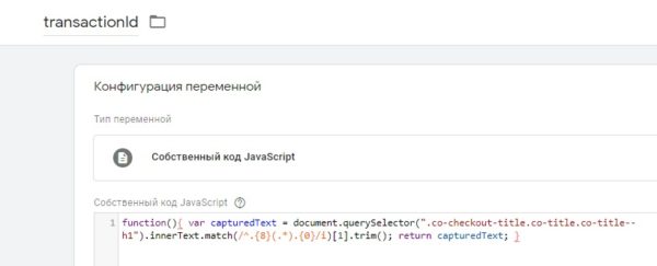 Сохраняем переменную. Аналогично проделываем со всеми остальными переменными. Не забудьте, что общая сумма транзакции (transactionTotal) должна быть числом. Если вы не хотите использовать расширение GTM Variable Builder, то тогда следует искать на странице “Спасибо” у конкретного элемента его CSS-селектор, копировать его, при необходимости проводить манипуляции с этим элементом (преобразование типа данных, обрезание части текста и т.д.), а после добавить в пользовательскую переменную типа Собственный код JavaScript.