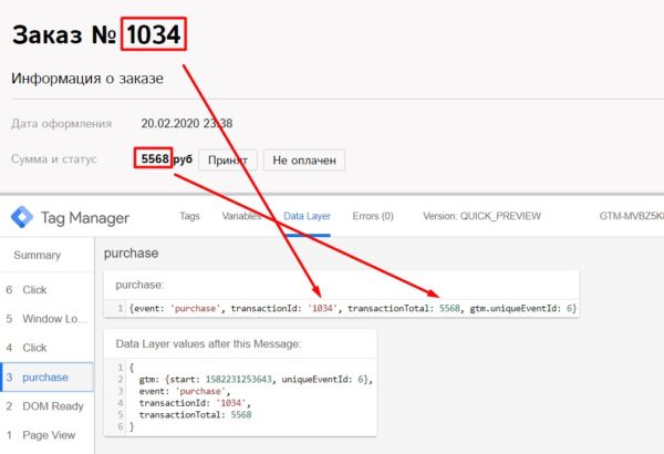 В Google Tag Manager в режиме предварительного просмотра на вкладке Variables напротив конкретного события отображаются данные. Значения переменных с типом number (число) выводятся без кавычек, а с типом string (строка) в кавычках. Как в случае с transactionId: