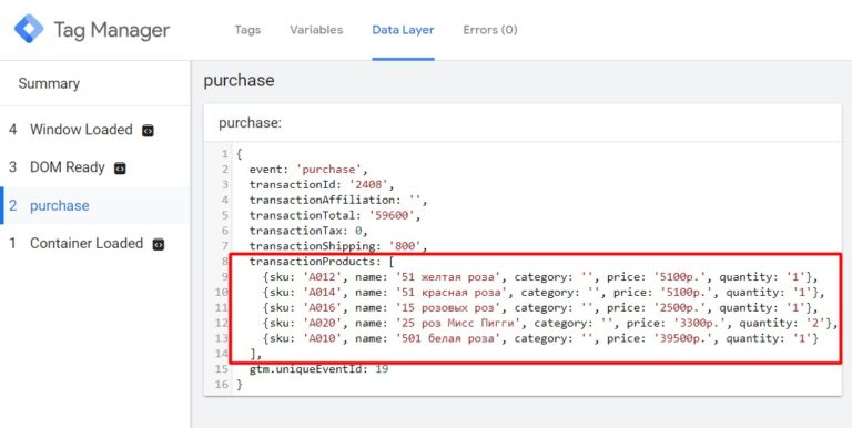 Тогда при срабатывании события покупки (purchase) массив данных будет сформирован верно: