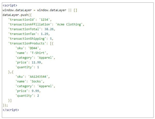 О том, как настроить отслеживание электронной торговли, написано в официальной справке Google. Нет ничего лучше, чем следовать оригинальному источнику. Все сведения о транзакциях должны передаваться через уровень данных.