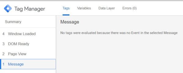 Поскольку этот dataLayer.push также не имеет параметра event, в режиме отладки он также будет отображаться как Message.