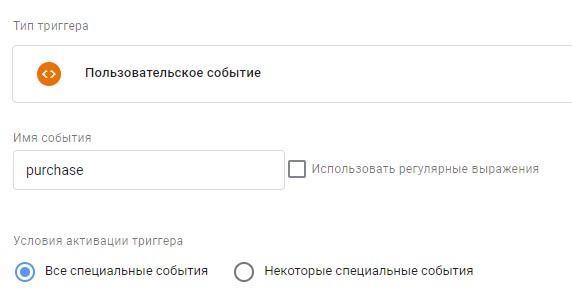 Чтобы создать пользовательское событие, перейдите на вкладку Триггеры и создайте триггер типа Пользовательское событие с именем события purchase: