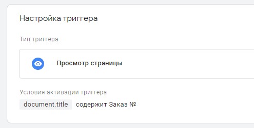 В качестве условия активации триггера можно указать конкретно страницу “Спасибо”. У меня в примере это реализовано через заголовок страницы, который на странице успешного заказа имеет title Заказ №: