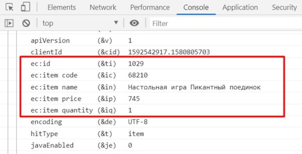 Это покупка, которая была отправлена в Google Analytics. ec:id – идентификатор транзакции, ec:revenue – общая сумма покупки (в Google Analytics – Доход), а также стоимость доставки ec:shipping. Если вы передаете информацию о купленных товарах, то прокрутите консоль внизу. Вы должны увидеть такие данные: