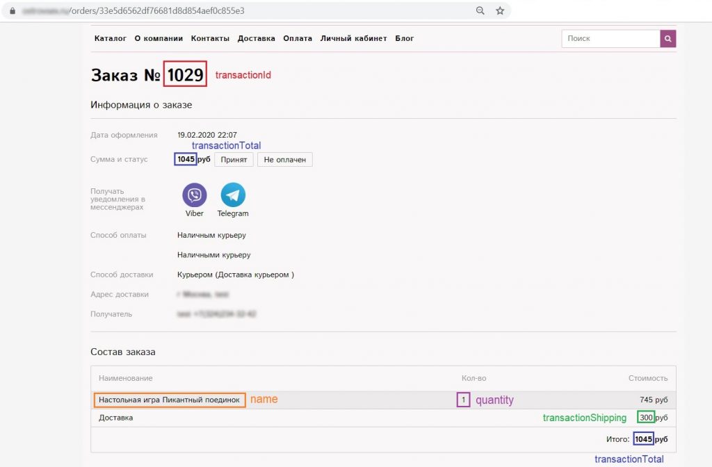 Итак, что же у нас получилось? На примере моего интернет-магазина на странице “Спасибо” я могу извлечь 2 обязательные переменные для данных о транзакции (transactionId и transactionTotal), 1 необязательную (transactionShipping) и 2 из 4 для формирования данных о товаре (name и quantity). На странице успешного оформления покупки нет только ID товара (sku) и цены за единицу товара (price). В этом случае я могу отправить только 2 переменные в уровень данных, а затем эту информацию в Google Analytics.