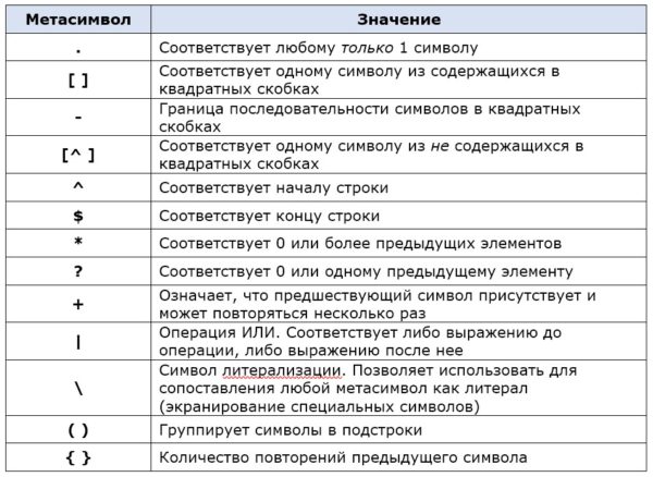 Символы бывают двух видов: литералы (обычные) и метасимволы (специальные). Большинство символов в регулярном выражении представляют сами себя за исключением специальных символов: